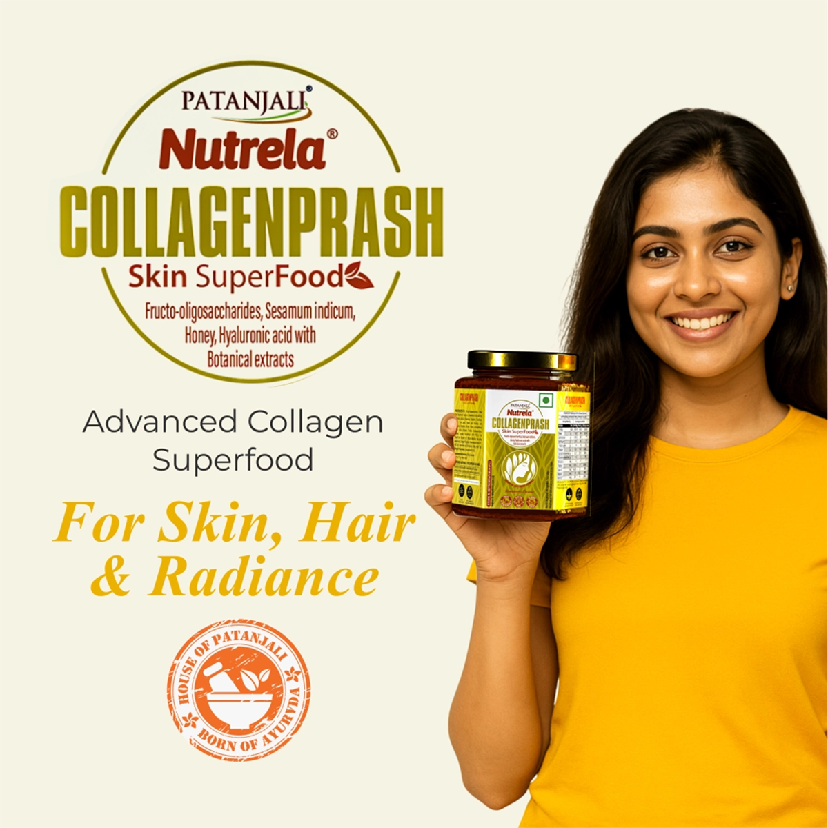 Skin is the largest organ and Collagen (anti-ageing protein) is the most abundant protein and responsible for youthfulness, however after the age of 25 years, a gradual decline (around 1%) in Collagen production every year, which leads the noticeable changes like skin wrinkles, age spot, loss of elasticity, laxity, and rough-textured. Scientific research from the last 2 decades has conclusively proven that what you consumed has a bigger impact on your skin than what you put on top, keeping these scientific facts in mind, Patanjali R & D team has brought up the PATANJALI NUTRELA COLLAGENPRASH (SKIN SUPERFOOD), which is enriched with Plant based collagen peptide form Sesame along with other botanical extracts and bio-actives, which act synergistically and enhance the Collagen synthesis in Human Fibroblast cells and also helps to inhibit the Collagenase enzyme activity.